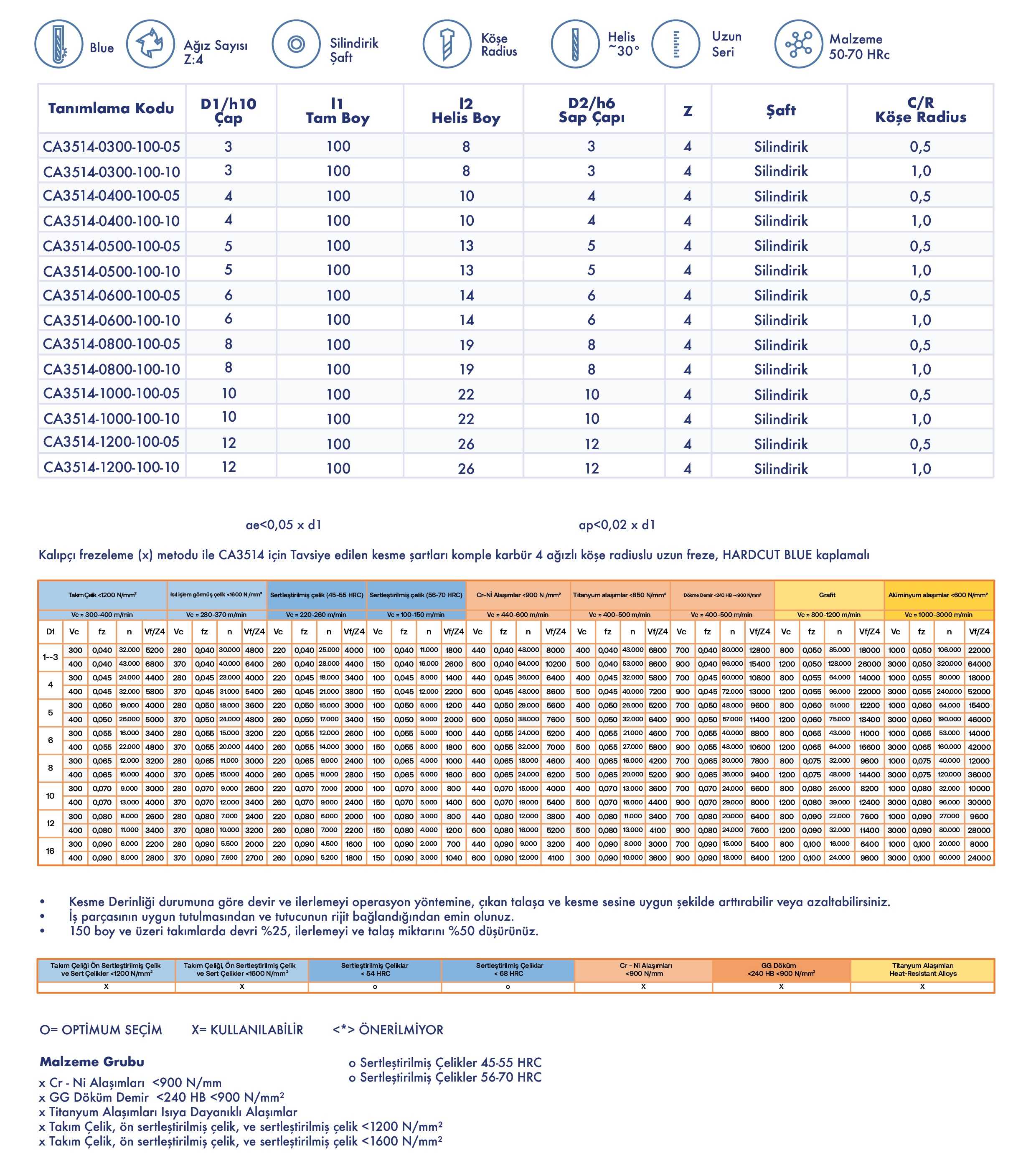 x Takım Çelik, ön sertleştirilmiş çelik, ve sertleştirilmiş çelik <1600 N/mm²