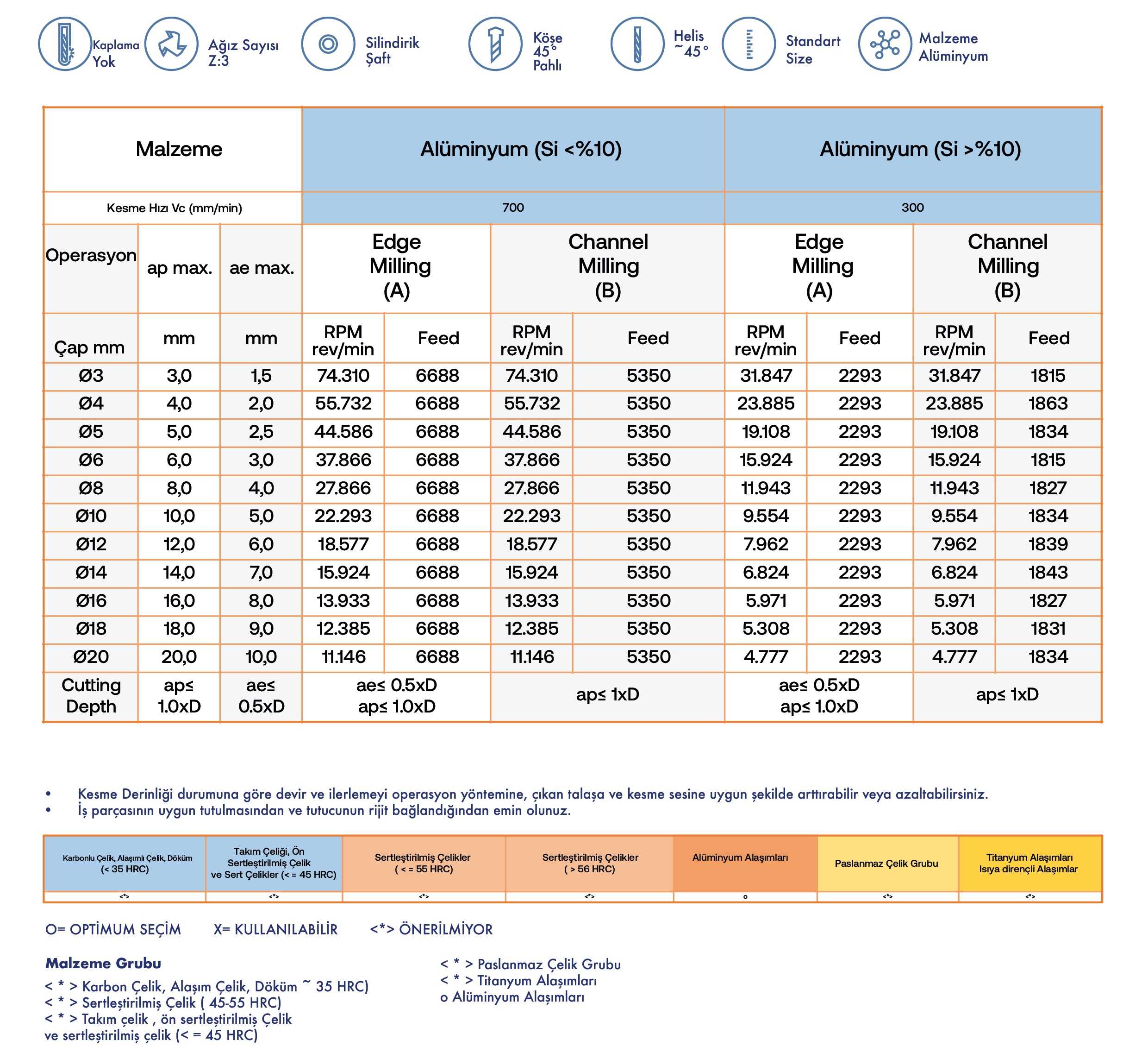 O= OPTİMUM SEÇİM X= KULLANILABİLİR <*> ÖNERİLMİYOR